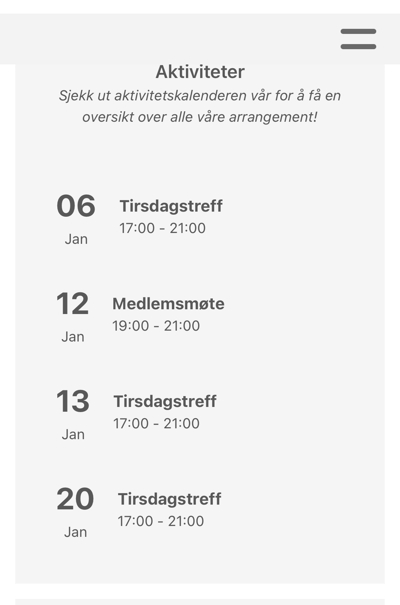 Se forsida her på hjemmesida for dato på Tirsdagstreffet. Hvis det blir endring legger vi ut melding.